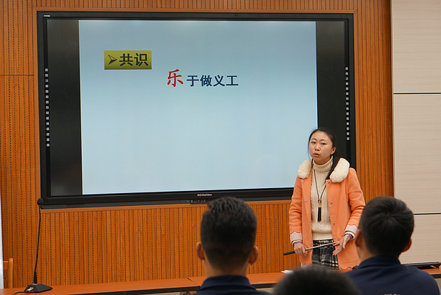 行至此处,已动力满满,主持人进一步带着同学们探讨,义工精神到底是什么?又包含着哪些关键词呢?坚持、无私、奉献、责任感、娱乐感……一个个充满暖意的词汇出现在了黑板上,就着这些词,同学们继续分享着自己的成长与收获。