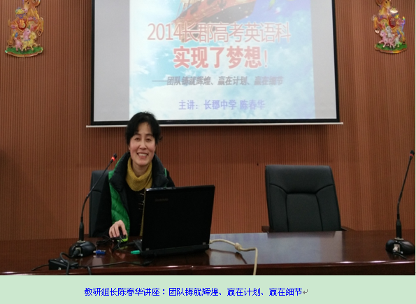2015年3月22日上午,长郡大家庭来自全省110多所合作学校的老师们齐聚长郡校园,联合开展长郡远程教育2015年高考研讨系列活动。英语分会场内来自全省100多所合作学校的英语教师参加了本次会议。会议由长郡中学英语教研组组长陈春华老师主持。