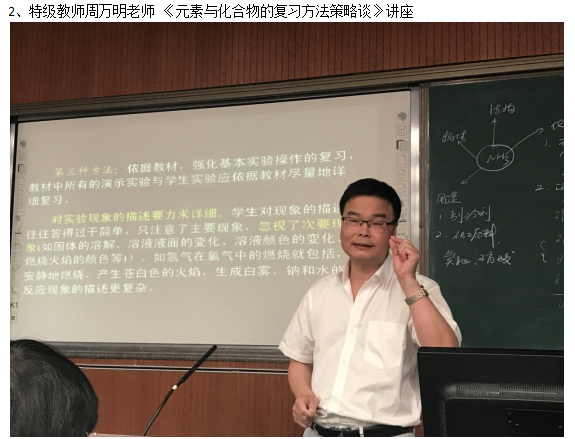 特级教师、长郡中学化学组高二备课组长周万明老师在评课后,针对元素化合物知识复习的进行了专题讲座,从“结构理论,指导先行;不同时段,不同方法;不同教材,相互渗透;善于总结,找出规律;重视信息,拓宽知识”五个角度谈了自己的看法,相信这对同仁的教学有一定的启发作用。