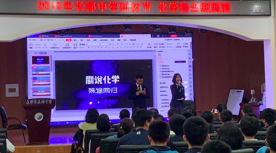4月23日下午文体活动课,长郡中学第十三届科技节之“剧说化学”活动在办公楼六楼举行。本次活动是长郡中学学子对化学与话剧融合的首次尝试,活动得到众多校领导的关心和支持,吸引了高一高二学生的广泛关注。现场座无虚席,活动异?;鸨?。本次话剧节目由高一高二年级各班推选,经过层层筛选最终推出三台话剧节目,分别是《殊途同归》、《聚会惊魂》、《认清自己本质的国王》。表演者身着具有化学元素的道具,以话剧表演的形式将教材上复杂的化学知识对观众呈现,别有一番趣味。正如教务处罗清华主任的总结:化学喜剧对化学知识学习的正面影响,丰富了化学学习方式,给大家带来了不一样的戏剧体验。陈来满副校长更是高度评价为“观一堂化学剧表演,胜读十年化学书”。
