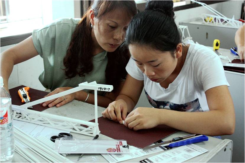 技能培训内容之一是以长郡中学教学实践项目---“悬臂梁结构设计”为载体,从中提取便于操作的内容作为教师技能培训任务。长郡中学通用技术教师彭曼君老师详细介绍了“悬臂梁结构设计”项目的由来、实施过程、实施要点、难点问题、注意事项等,并按两人一组进行了项目实践。老师们全神贯注地聆听,聚精会神地思考,全身心地投入悬臂梁结构的制作。经过4个小时的制作,所有参训老师全部完成了悬臂梁的制作并以优异的成绩通过考核,其中15中杨莉等三位老师设计制作的结构,造型优美,做工精良,取得了承重测试的满分。