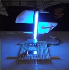 三、让学生成为实实在在的学习主体。现代教学理论强调教学本质上是学生的学习过程,是教师有目的、有计划地组织学生实现有效学习的活动过程。在台灯制作实践作品评价教学过程中,我注意认真地倾听同学们的发言,偶尔给予一点提示、引导或肯定,看似“无为”,我在提出教学目标与要求后,即将主要过程和时间交给了学生,让学生逐组上台展示作品、介绍情况。同学们兴致勃勃,讲述自己如何运用设计的原则讨论和制定设计方案,如何分工合作,别出心裁地制作出有特色的创新作品,并对作品自行评判。其他组的同学则参照评价的标准进行评价,发表见解。整个课堂十分活跃,学生的思维活跃,参与的积极性很高,同学们的作品也富有创意。如一小组所展示的设计主题为《无影灯》的作品(见右图),该作品针对学生及写作的人群设计,灯光以同样的亮度从3个不同角度分别照射在桌面,每个灯有单独的开关控制,并可调整灯光的照射角度,达到无影的功能。又如第三小组设计的《一帆风顺》工艺灯(见左图),学生创造性地使用了竹筷、棉绳和胶水等材料,巧妙地将灯与小竹排和帆结合,形成富有浪漫风格的工艺灯,竹排型的台架还可放置书本和学习用品,做工精致,结构设计合理。