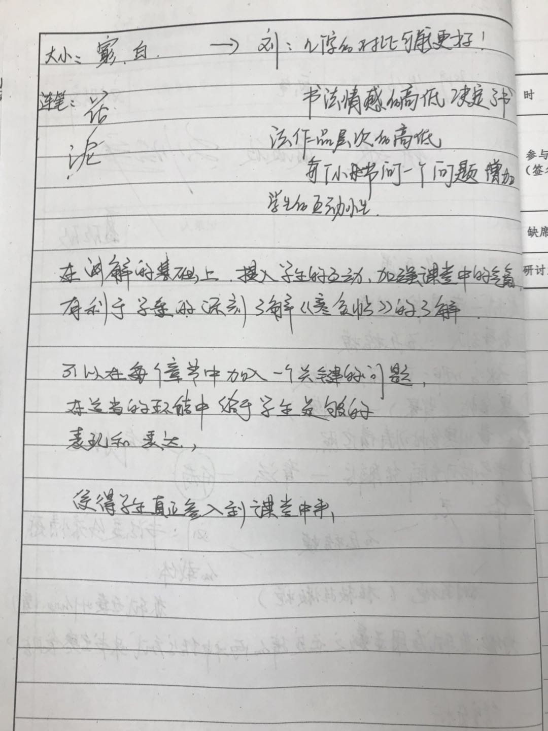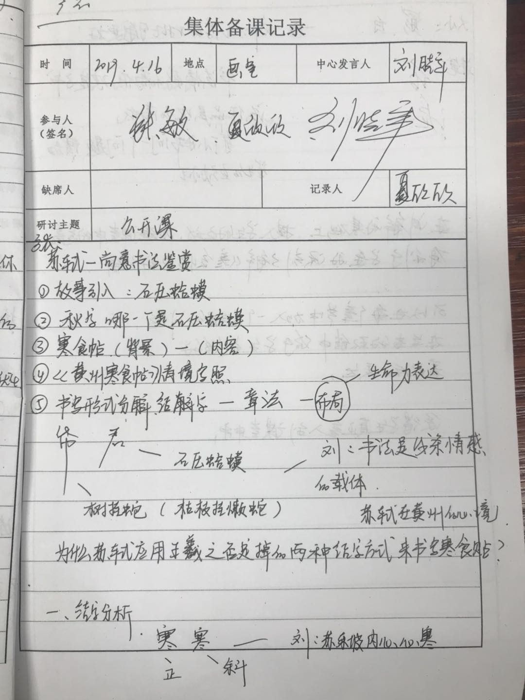 高一、高二“优秀课例展示”集体备课第二次讨论 作者: 来源: 发布时间:2019-04-22 浏览次数: 次 【字体:小 大】 第二次讨论针对张敏老师《尚意书风--苏东坡书法鉴赏》课程结构的梳理和学生之间的互动环节。, 分享到: 【打印正文】