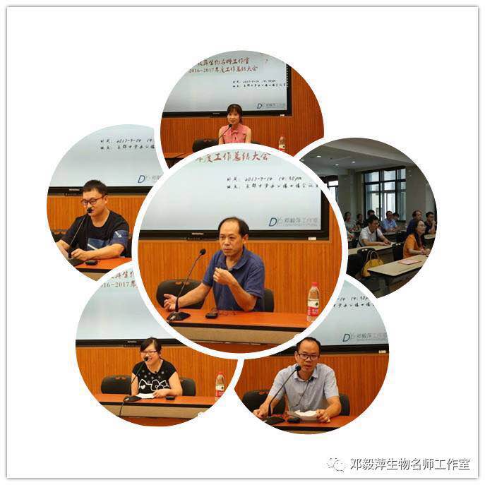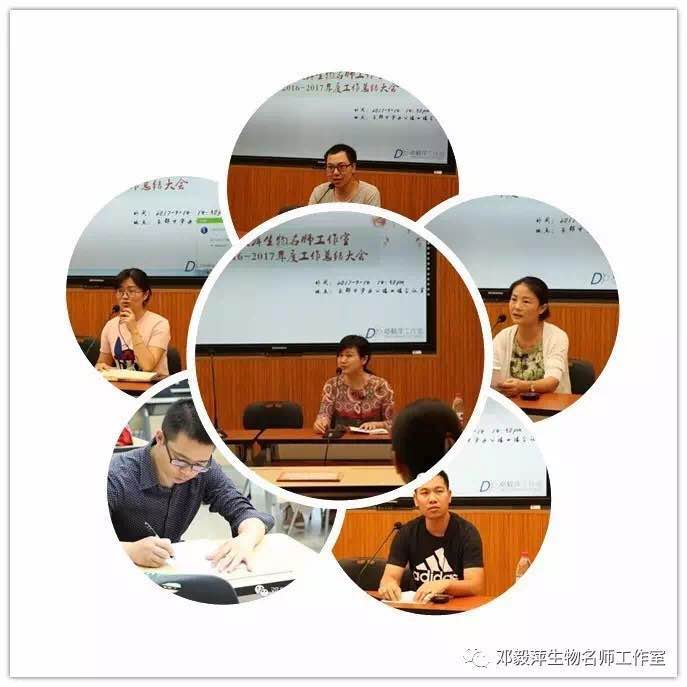 邓老师分别从定位工作室目标、建设名师工作室;制定规章制度、管理考核学员;引领辐射示范、促进名师成长;带好一支团队、培养优秀教师;带动一门学科、引领学科发展;孵化一批成果、开发教学资源;辐射一个区域、推广教学成果;经费开支保障、工作支持到位;团队齐心协力、工作成效显著等八个方面做全面总结。另外,还制定了2017年下半年生物名师工作室的工作计划“常规:一个计划,一个总结;教学:一节微课,一节研究课;教研:一篇笔记,一篇论文;辐射:一篇微信公众号,一个微讲座。