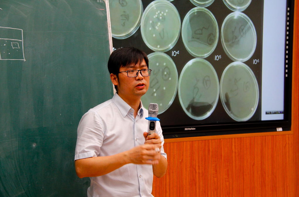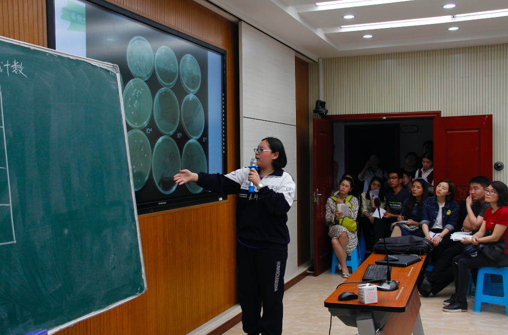第一轮展示由第三组、第一组和第二组分别展示,但是实验结果均存在一些不同,在胡昆老师的引导之下,全班同学积极讨论并针对性地推测三组同学实验失败的可能原因。第二轮展示三组实验小组经过反思、改进后的实验方案再次实验的结果,针对这一轮结果,胡昆老师通过实际数据及时给予学生现场计算的实战机会,并引导学生对计数的细化处理,对于实验结果的差异给出合理性解释,特别在第三组成员展示后结合教材对实验结果进行进一步的分析说明,最后总结实验操作中的注意事项、对实验结果的计数及数据处理,并指出科学研究中的一些不可预的困难需要研究者不断跨越才能得出较好的结果,帮助学生树立了良好的科学价值观。整堂课由学生主场,教师引导分析,通体流畅,层次分明。