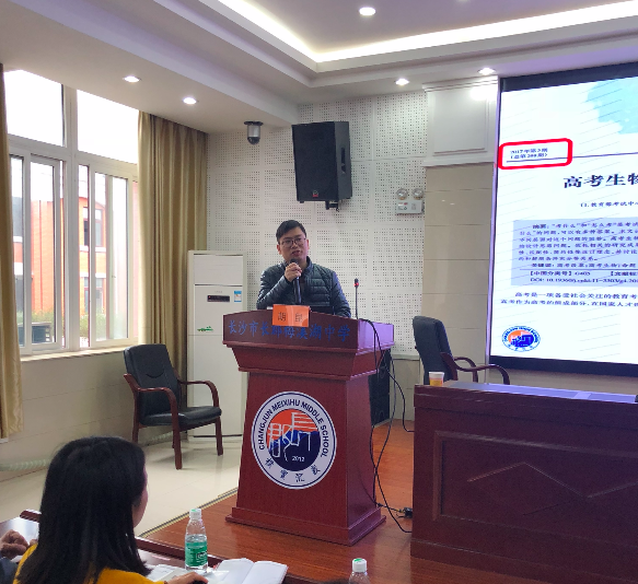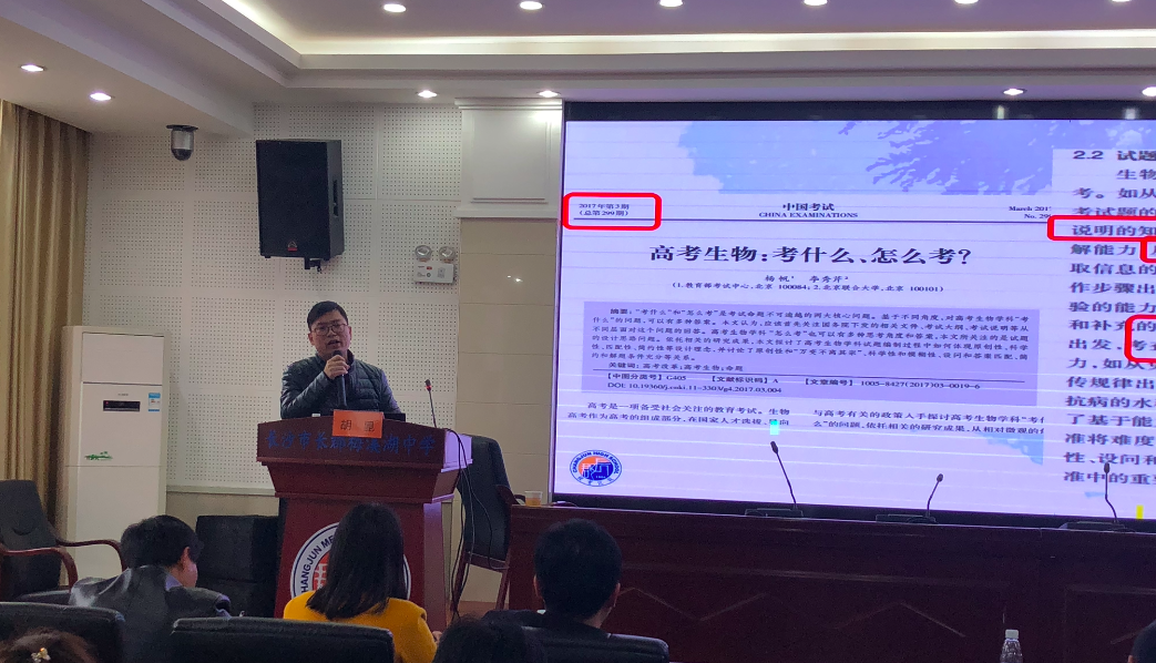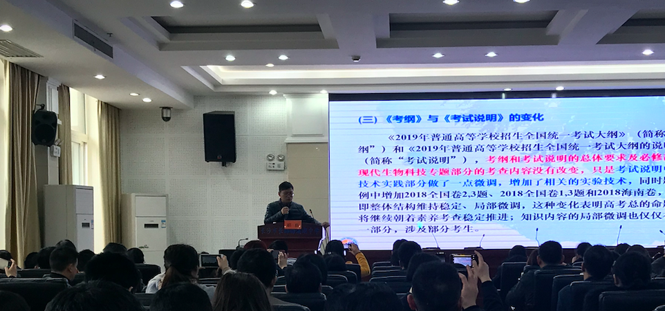 接着,由长郡中学生物教研组长胡昆进行高考复习讲座,主要包括“高考分析”与“复习对策”两个板块。首先胡昆老师从高考命题依据及高考评价体系的中心思想进行分析,从根本目标上反映了学校对学生关键能力及核心素养的培养的必要性。然后,胡昆老师针对考纲与考试说明的变化及改动原因进行分析,并指出面对新加入的考试内容,老师们应注意对2019年高考中将出现的考察形式可能性的分析。接着,胡昆老师展示了以长郡中学为例的高考备考流程及策略,并以二轮复习为重点展开展示,二轮复习以“杜绝重综合,轻基??;杜绝重思路,轻过程”为指导思想,辅导学生构建清晰的知识体系及规范的答题习惯,并结合历年高考数据分析,明确高考变化趋势,为教师备考提供良好的思路与方向。