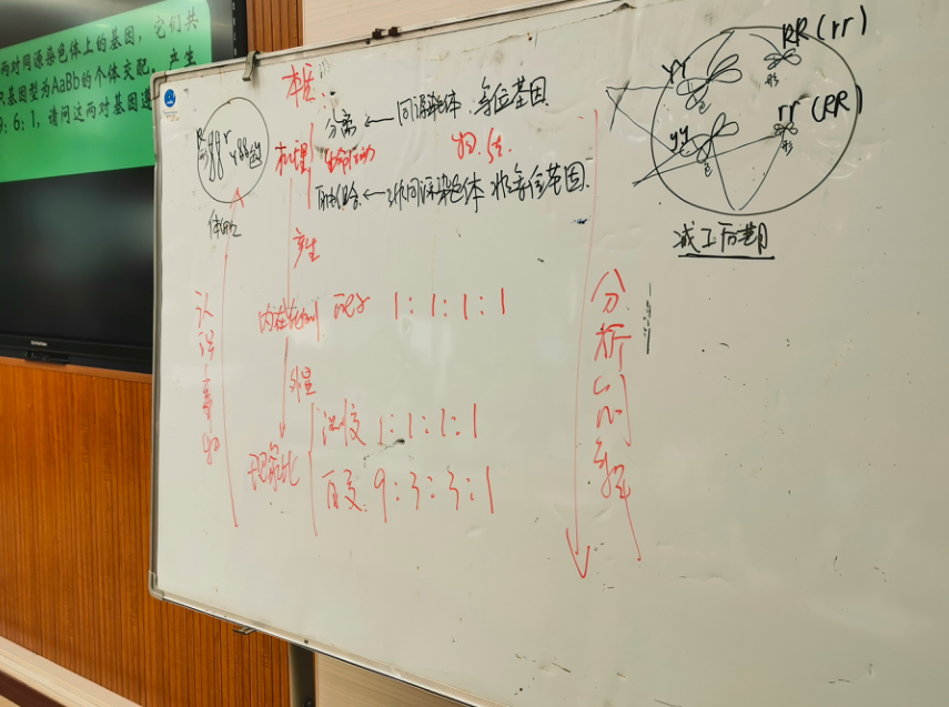 肖烨老师的《自由组合定律》一课基于学生已经学习过减数分裂的过程,再来认识孟德尔的两对相对性状的杂交实验。首先肖老师带领学生回顾一对相对性状杂交实验的内容,并让学生绘制两对相对性状在不同细胞中的分布情况,为自由组合定律的学习做好铺垫。随后肖烨老师要求学生首先写出两对相对性状的遗传图解,再用棋盘法讨论分析9:3:3:1的实质规律,最后对应到减数分裂中细胞的生命活动与物质基础,凸显遗传规律的本质。本堂课中,肖烨老师让学生迁移一对相对性状的遗传图解画出两对相对性状的遗传图解,让学生通过思考获得新知识,方法上,一反假说演绎法的常规思路,让学生先画遗传图解,透过现象看本质,也让学生体会到遗传学家孟德尔的伟大之处。