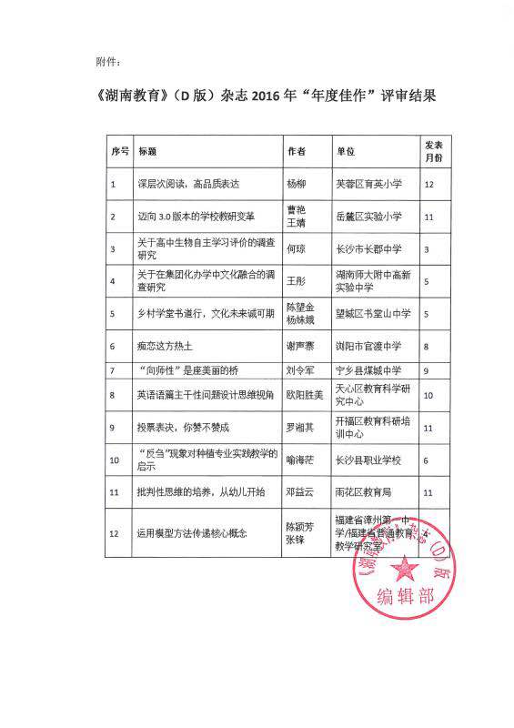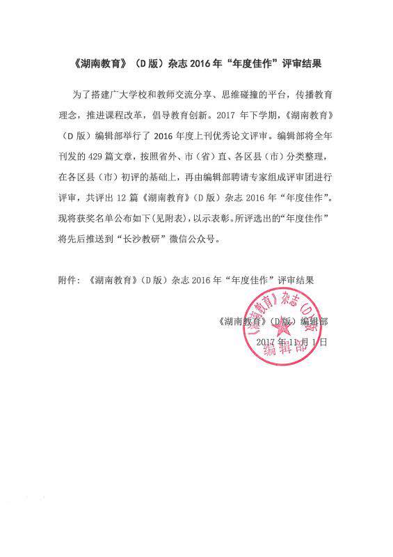 【论文】我校何琼老师的论文获《湖南教育》(D版)2016“年度佳作”殊荣 作者:生物教研组 来源:长郡中学 发布时间:2017-12-23 浏览次数: 次 【字体:小 大】 日前,从《湖南教育》(D版)编辑部传来喜讯,我校青年生物教师何琼老师的研究论文获2016年”年度佳作“殊荣。 分享到: 【打印正文】