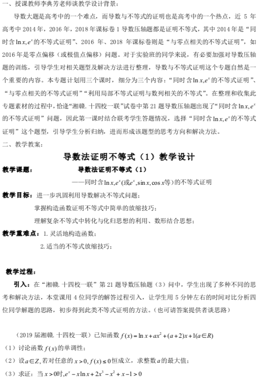 【数学】李典芳老师公开课——《用导数证明不等式(一)》 作者: 来源: 发布时间:2019-03-19 浏览次数: 次 【字体:小 大】 3月13日,高三年级的李典芳老师为大家带来一堂二轮复习课《用导数证明不等式(一)》 以下是李老师的教学设计 智能标签: 公开课 相关内容 分享到: 【打印正文】