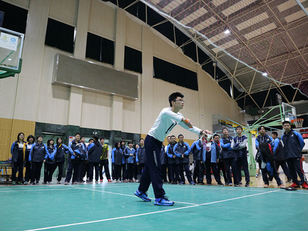 第三场为男子单打,1511班派出“白色秋衣哥”帅气登场,“秋衣哥”场上以敏捷的脚步移动、跳跃、转体和强势的挥拍扣杀连连得分,轻松两连胜,赢得场上喝彩不断,将比赛推向高潮!