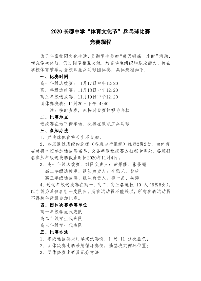 2020长郡中学体育节乒乓球比赛竞赛规程