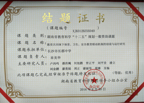 由我校承担的湖南省教育科学“十二五”规划课题《教育共同体下体育、卫生、安全教育联动机制的创设与运行研究》经过三年的研究通过了湖南省教育科学规划办在今年组织的会议鉴定,本课题主持人辜美华老师对课题研究成果展示与报告,获得评审组的高度赞赏,同时该项课题被鉴定为优秀等级。