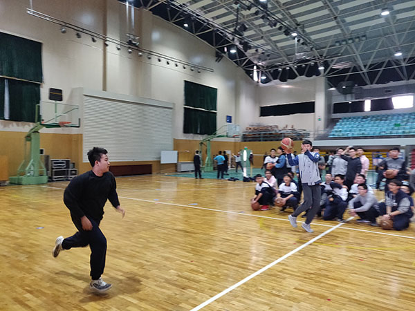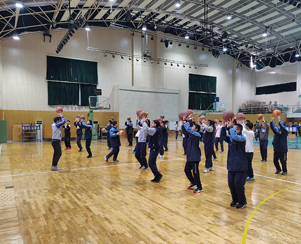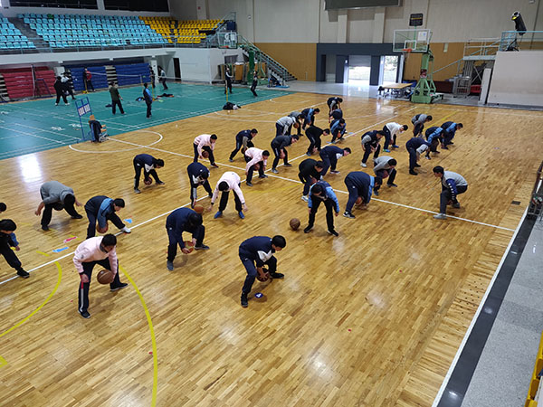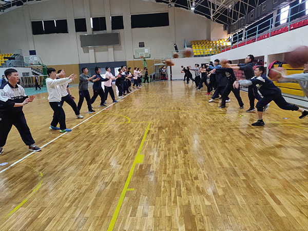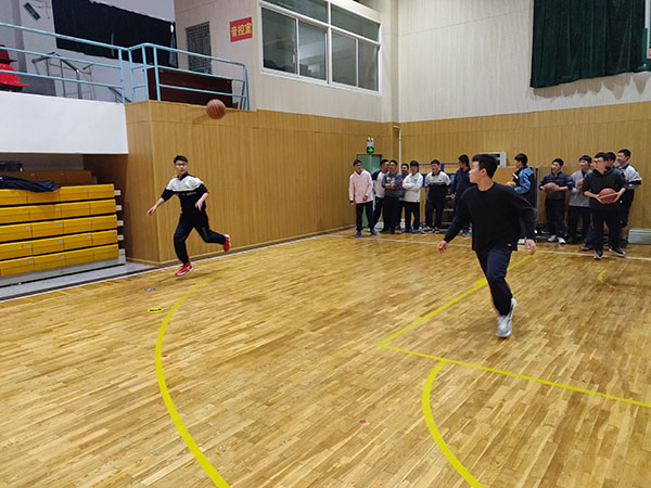 首先,黄景能老师带领学生以篮球操开始熟悉球感,练习原地掌控球的能力,再跟学生讲解了传接球投篮的技术要领并进行示范。然后降低难度,组织学生练习原地双手胸前传球,再逐步增加难度,最后进行两人全场的传接球投篮练习。学生的练习通过由易到难的过程,逐步掌握两人传接球投篮的技术动作。