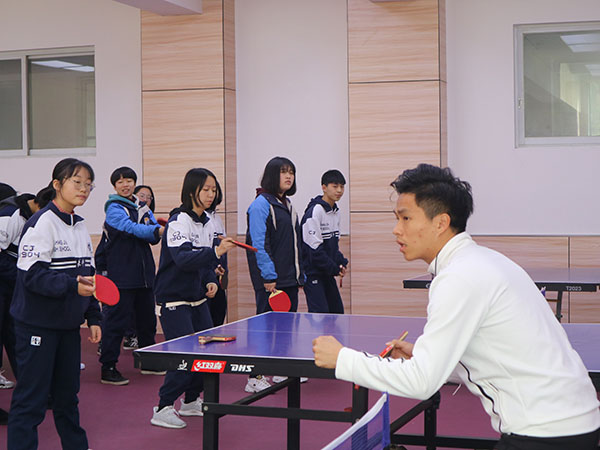 课堂中,方桂钰老师首先向同学们讲解、示范反手推挡技术,并带领学生进行徒手动作的练习。随后再组织学生进行有球的练习,从定点的练习到两点移动的练习,难度逐渐增加。最后,方桂钰老师还组织进行了“绕台推挡击球”的游戏,在提高反手推挡技术的同时,也增强了学生的学习兴趣,从而课堂气氛变得更加活跃。