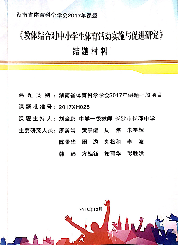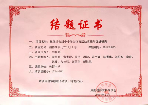 三月,虽是春暖花开的季节,由刘金鹏老师主持的湖南省体育科学学会的省级课题《教体结合对中小学生体育活动实施与促进研究》历时一年结出了鲜甜的果实,最终结题并获优秀等级。体育教研组廖勇娟、黄景能、周游、李波、方桂钰、彭胜洪6位老师参与课题研究。