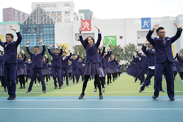 第三节课下课后,伴随欢快悦耳的音乐,整齐有力的击掌声,我们看到高一年级的大课间活动展示。“哇!他们在跳街舞!”“好帅!”“好酷!”,田径场周围挤满了围观大课间的教师和学生且不断发出感叹声。如果说街舞给所有观众耳目一新的、炫酷感觉,那么《阳光季节》就是给大家展现出青春活泼、高雅的感觉。
