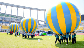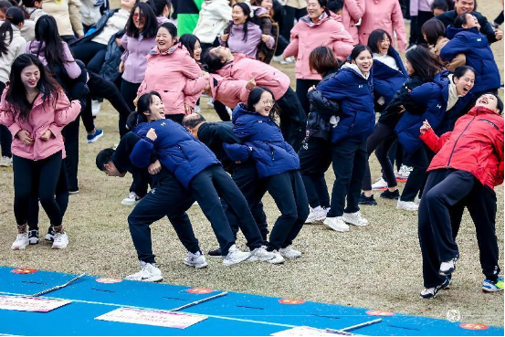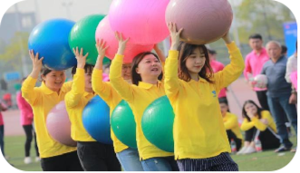 比赛方法:比赛开始前起点10名队员协力把球抬起做准备,身体任何部位不能越过起点线;听到裁判长发令哨声响起,比赛开始,队员们托着大球快速跑到折返点,然后折返把球运到终(起)点,当第一名队员身体的任何部位越过终点线,比赛结束,根据比赛时间长短排列队伍名次。
