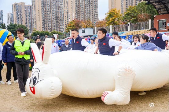 比赛方法:8名队员进入到器材里面在起点处做准备。待裁判长发令开始比赛,队员们将兔子(乌龟)抬起在跑道上前进,然后绕折返点回到起点(即终点),即完成比赛。根据所用时间长短排列名次。