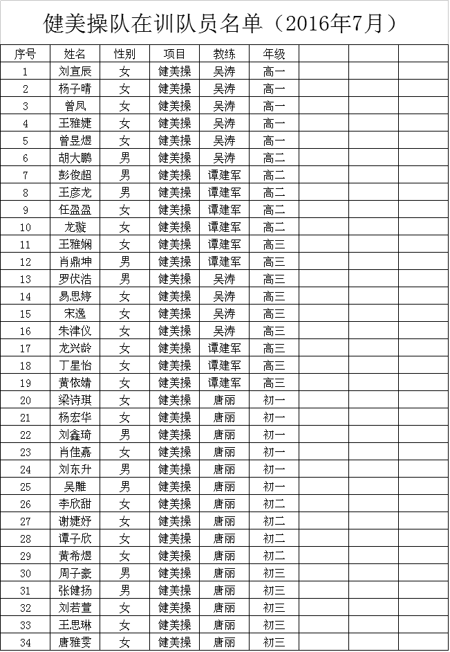 健美操队在训队员名单(2016年7月)