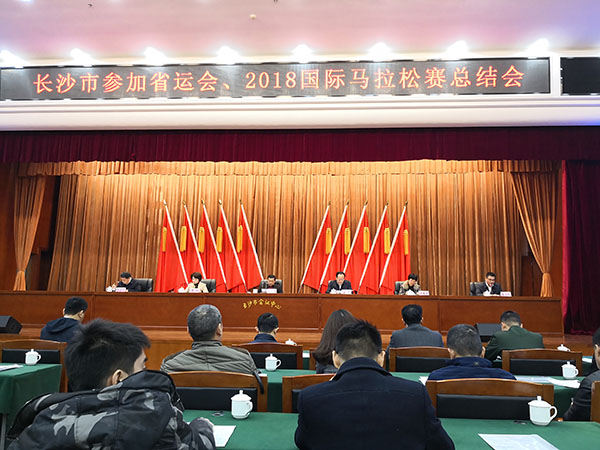 12月5日,长沙市体育代表团关于参加湖南省第十三届运动会、2018年长沙国际马拉松赛总结会召开,市领导赵建强、陈中、李平出席会议。长沙市体育局党委书记李文格代表长沙市体育代表团作参加省十三运会工作总结报告。