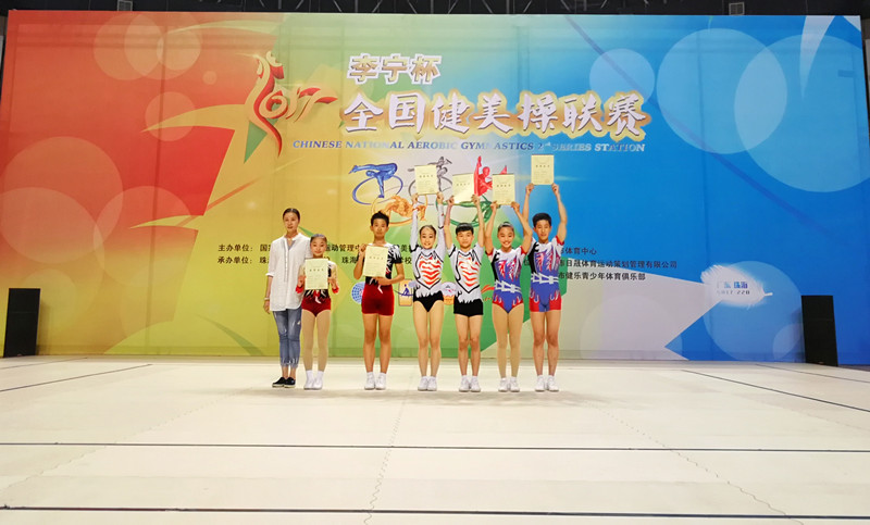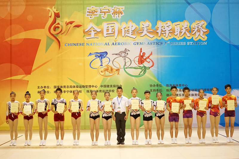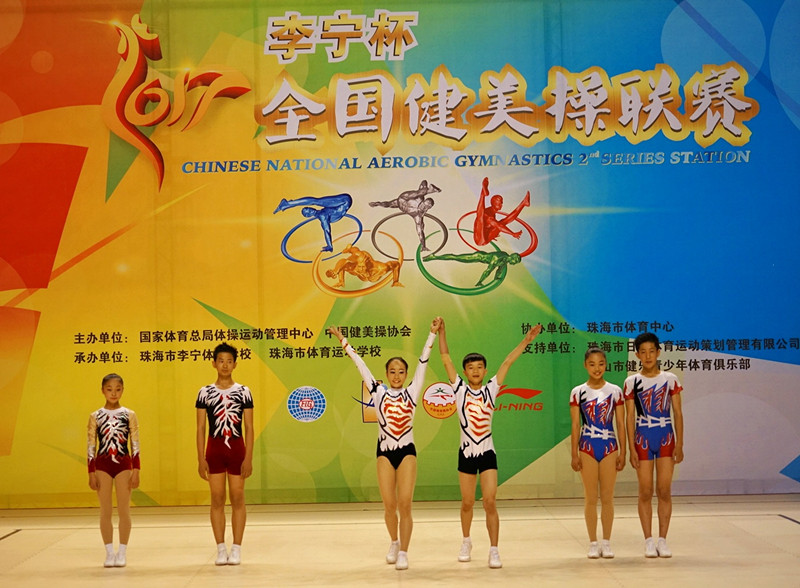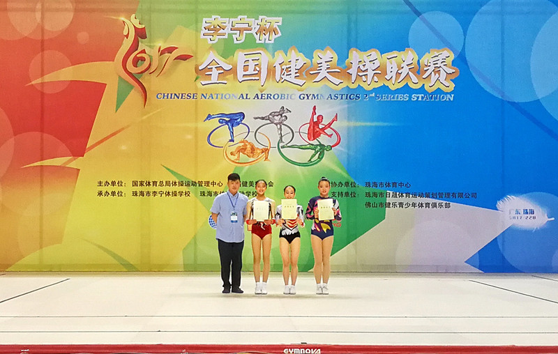 2017年全国健美操联赛第二站于5月17日--5月22日在珠海举行,本次比赛参赛队伍共有87支,中学有56支,其中包括传统强队--山西临汾市第三中学和长沙市第一中学。我校健美操队在领队谭建军老师、教练唐丽老师的带领下,参加了年龄一组五个项目(男单、女单、混双、三人、五人)的比赛,在5月20日这个特别的日子里,进行了第一场决赛,我队女单选手李欣甜、混双选手李欣甜与刘鑫琦,不畏强敌,技压临汾三中与长沙市第一中学,勇夺两金;在5月21日第二场决赛中我队五人操成员刘鑫琦、杨宏华、谢婕妤、谭子欣、黄希煜继续发扬了勇往直前、顽强拼搏的精神,从预赛第二反败为胜夺得第一,三人操为与第二名总分相等的成绩获得季军,最终取得三金一铜的成绩。