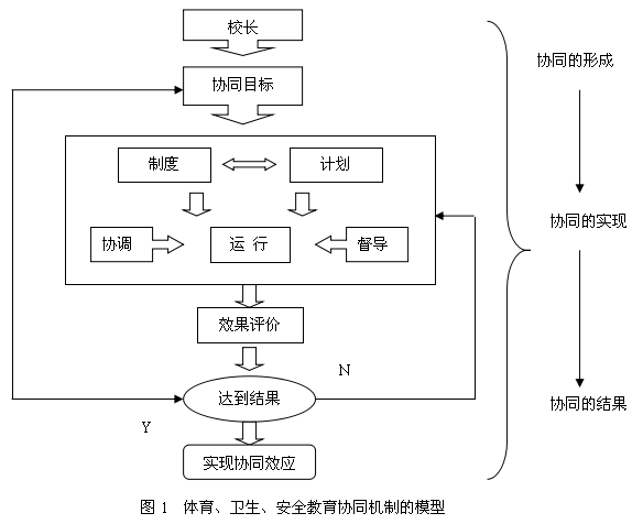 实现机制,主要包括协同管理的相关制度、计划实施的步骤的制定,以及各环节要素的配合、协调保证学校体育、卫生、安全教育的正常运行。首先,按照《学校体育工作条例》、《学校体育卫生工作条例》、《中华人民共和国教育法》相关法规文件,设立专门机构,配备专门人员,制定相关管理制度,做到责任到人,责权分明。第二,制定具体实施步骤,实施进度,按部就班的实施协同教育。其中包括学期中教学内容计划、进度,每节课具体的教学内容、方法都应该明确。第三,在运行操作中,肯定会出现不同的状况,当出现问题时,启动协调机制,相关管理部门出面进行协调、安排,同时这个过程中,还要加强督导,避免方向迷失。第四,学校体育、卫生、安全教育的相关要素要严格按照《中小学体育器材和场地》、《中小学卫生器材设施配备目录》等文件做好规划,保证教学工作的顺利开展。另外,不能忽视资金的投入,做到城区、农村中学各方面教学条件均衡。