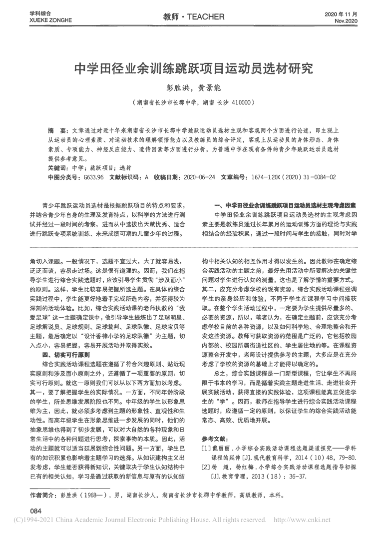 论文——中学田径业余训练跳跃项目运动员选材研究