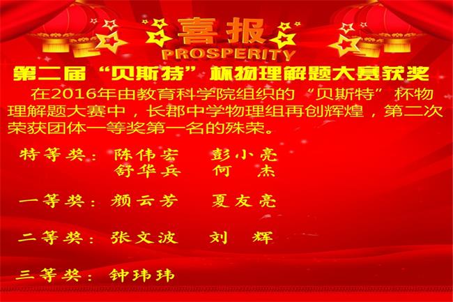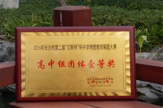 2016年第二届两年一度的“贝斯特”杯物理解题大赛在长沙市湘一芙蓉中学如期举行,来自长沙各初高中学均派出了自己的参赛队伍。12月24日,参赛者成绩得以公布。长郡中学战果斐然,特等奖名额12人,长郡中学独占4人。此外还包含一等奖2人、二等奖2人、三等奖1人,团体总分遥遥领先。继上一届“贝斯特”杯团体一等奖第一名之后再一次获得此殊荣。
