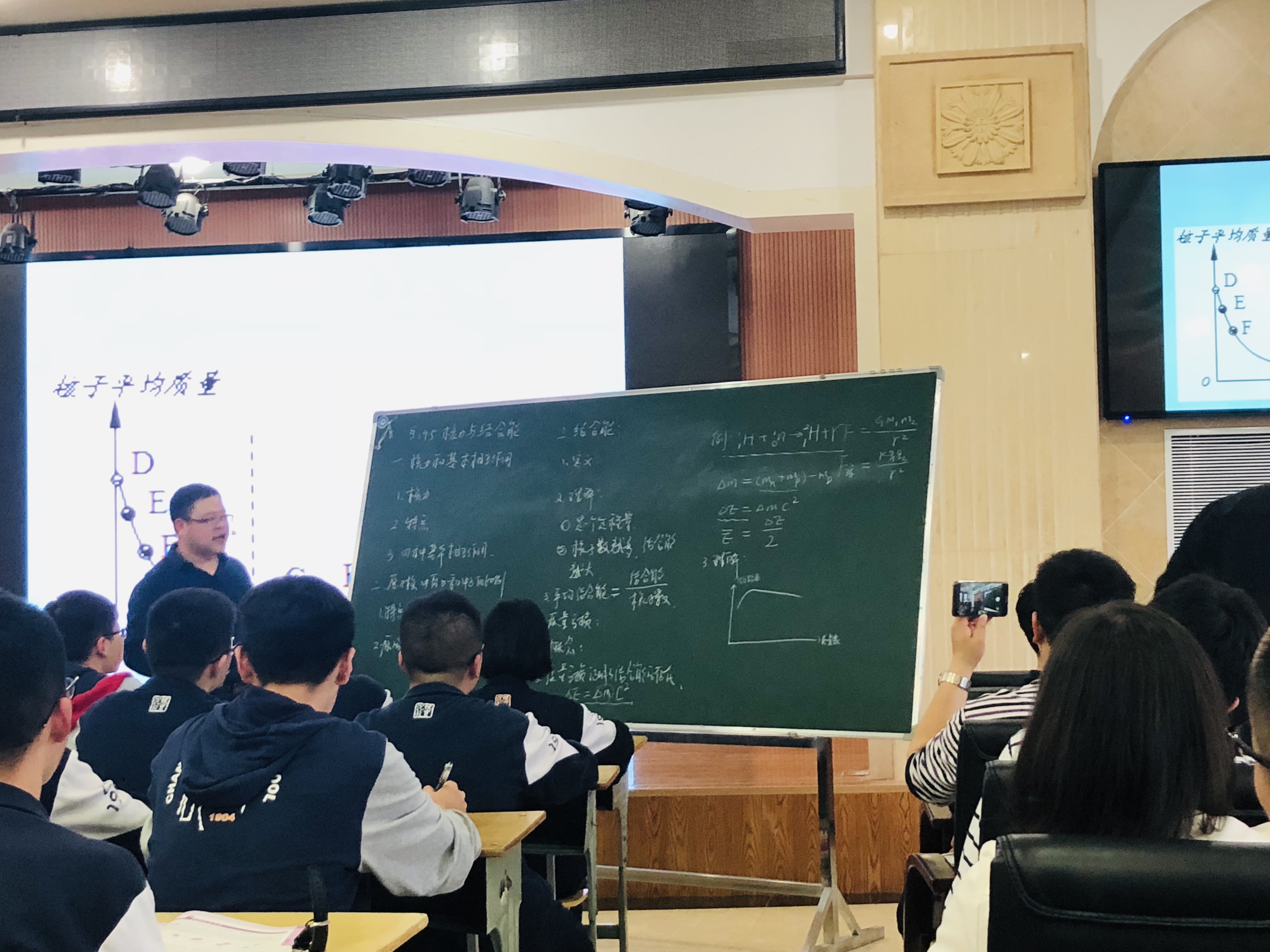第一堂是张文波老师的高二新课内容,主题为《核力与结合能》。把这节课作为一节公开课,非常不好讲,但张老师通过引导学生比较质子间的万有引力和库仑斥力,得出核子间必有第三种力,吊足学生胃口,从而引入核力概念。接下来,他层层递进,引导学生分析原子核中质子和中子的比例特点及其原因,使学生领略了自然界中神奇之美,也体验了科学思维的美妙;再由爱因斯坦的质能方程引导出结合能的概念,学生通过质量亏损来计算结合能,学生在计算中发现原子核中储存的巨大能量,并对这种能量的开发设想出了两种可能。既巩固了本节重点,又为下节课做铺垫。张老师的课堂设计一环扣一环,提问方式很有艺术,学生在课堂上思维活跃,充分体现了物理学科的科学思维特点,师生间有很好的互动,收获一片好评。