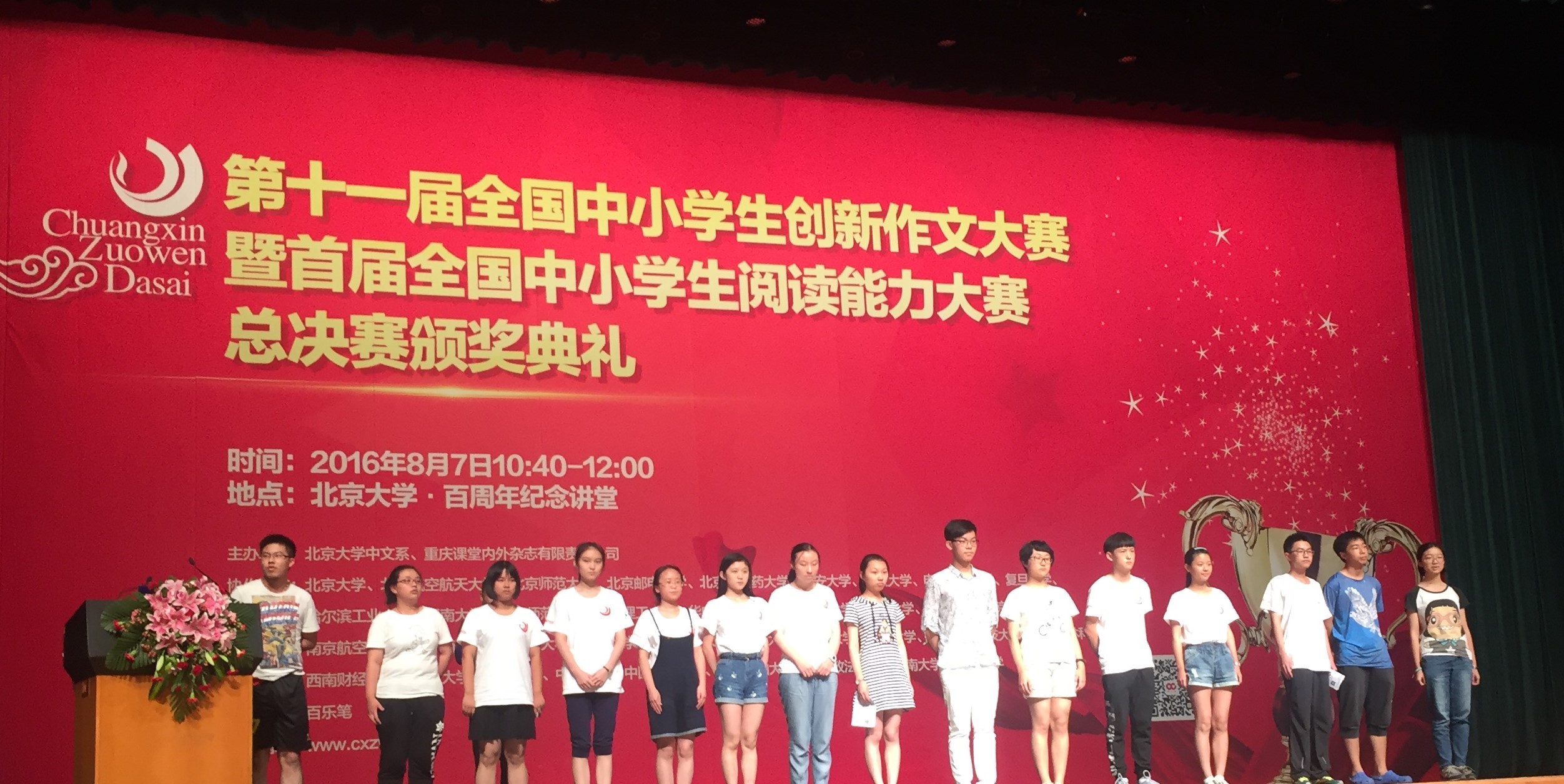 2016年8月5——7日,由北京大学中文系和重庆课堂内外杂志有限责任公司联合主办的全国中小学生创新作文大赛在北京大学举办决赛。在杨葵、李远莉老师的带队指导下,长郡中学龙卓然获得一等奖,罗兰西、刘雨晴、胡旖航获得二等奖,刘珂、刘潇、陈佳弦、杨彧、夏俊博获得三等奖。