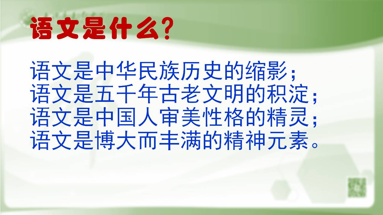 语文是中华民族历史的缩影; 语文是五千年古老文明的积淀; 语文是中国人审美性格的精灵; 语文是博大而丰满的精神元素。
