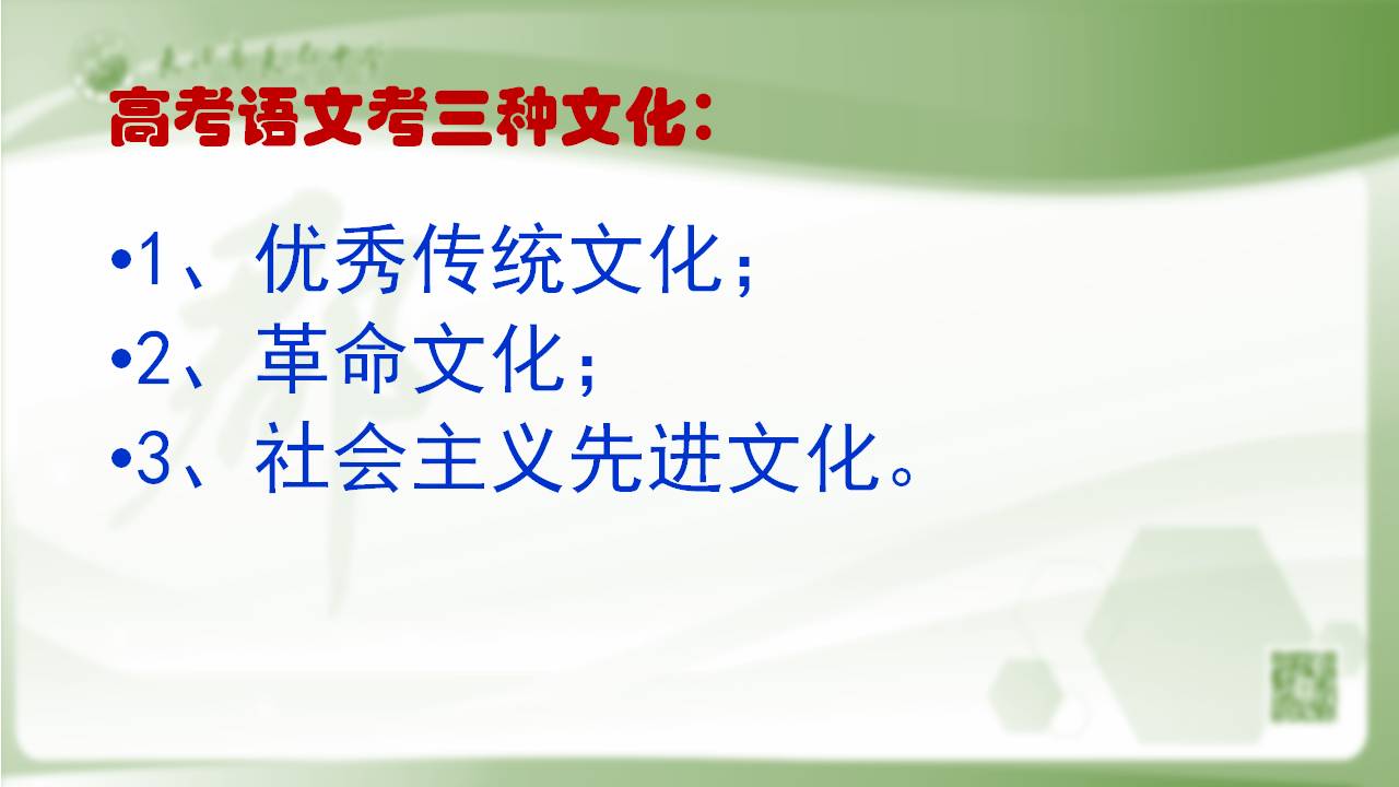 这是教育部考试中心语文命题组专家的一番话。在他的讲话中还提到了三种文化:优秀传统文化,革命文化,社会主义先进文化。
