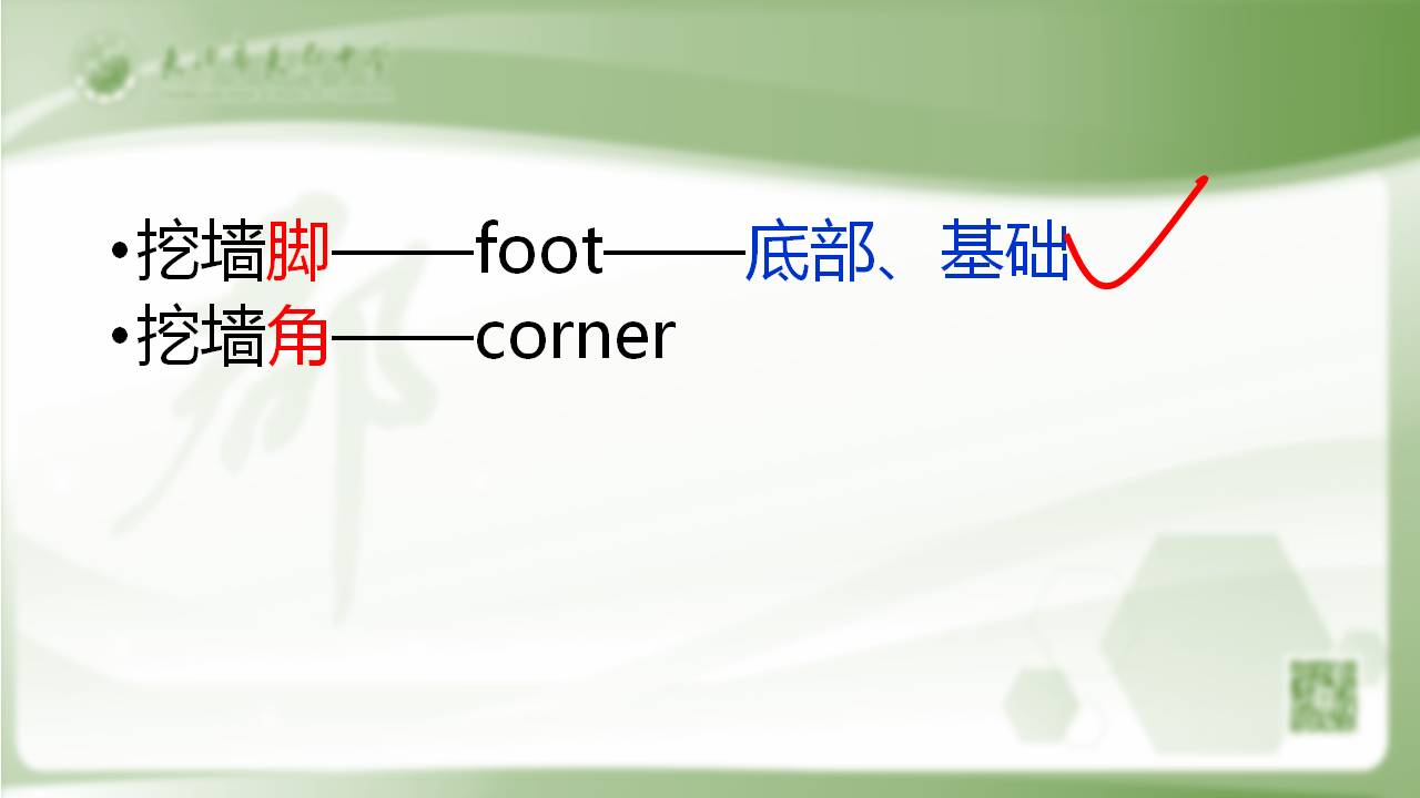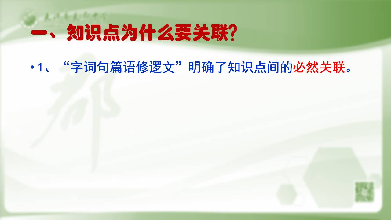 知识间的关联还可以做广义的理解,那就是学科间的关联。大家有没有发现有时语文问题单纯地用语文知识来解读反而容易将简单问题复杂化,如果我们能用其它学科介入就能化难为易。在讲概念间关系时很难让学生弄懂并列关系,这时你让他回忆下数学中集合的三大性质:明确性、互异性、无序性。他还会将高山与庐山并列吗?再比如,在识记字形时,学生可能搞不清是“挖墙脚”还是“挖墙角”,你何不给出两个英语单词:foot与corner。foot有底部、基础的意思,是不是不言自明了呢?