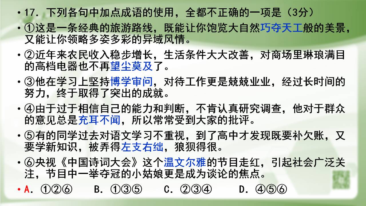 再来看今年全国2卷成语辨析题。(见投影)这当然是考查学生词语的积累和掌握情况,但我想请大家关注的是这6个句子,1、2、3句在传递正能量,传播好声音,4、5句又为考生的批判性思维的发挥留下了充分的空间,第6句,话题本身就有争议性。不能不说是设题者的匠心独运。做完这道题后,考生们无论是有心还是无意,都能感受到社会的进步、发展中的问题,是不是有引导学生全面地、发展地看问题的意思?你可以说我断章取义、强行关联,但教育有时候不就是这样润物无声的吗?如果您勉强认可我刚才的分析,那就是说高考实际印证了知识点的可能关联。