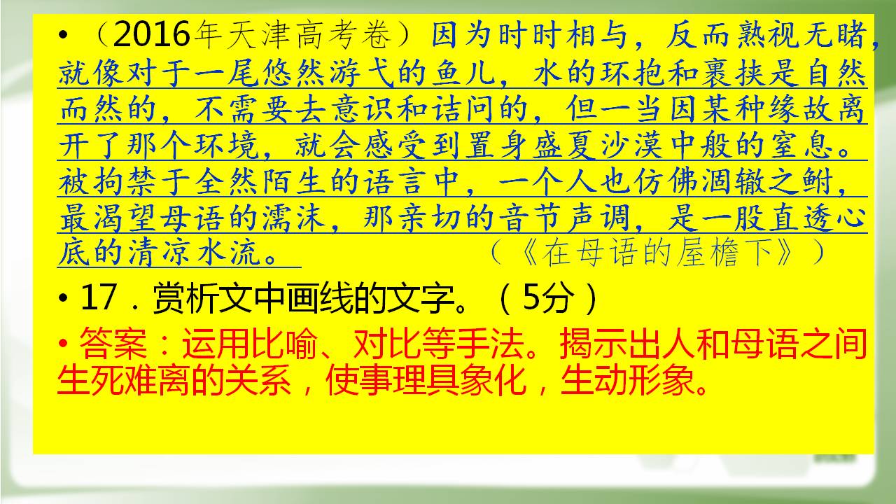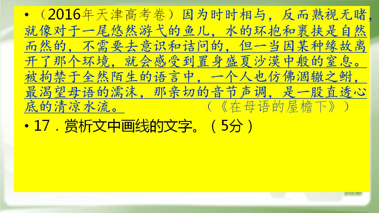 (2016年天津高考卷)因为时时相与,反而熟视无睹,就像对于一尾悠然游弋的鱼儿,水的环抱和裹挟是自然而然的,不需要去意识和诘问的,但一当因某种缘故离开了那个环境,就会感受到置身盛夏沙漠中般的窒息。被拘禁于全然陌生的语言中,一个人也仿佛涸辙之鲋,最渴望母语的濡沫,那亲切的音节声调,是一股直透心底的清凉水流。
