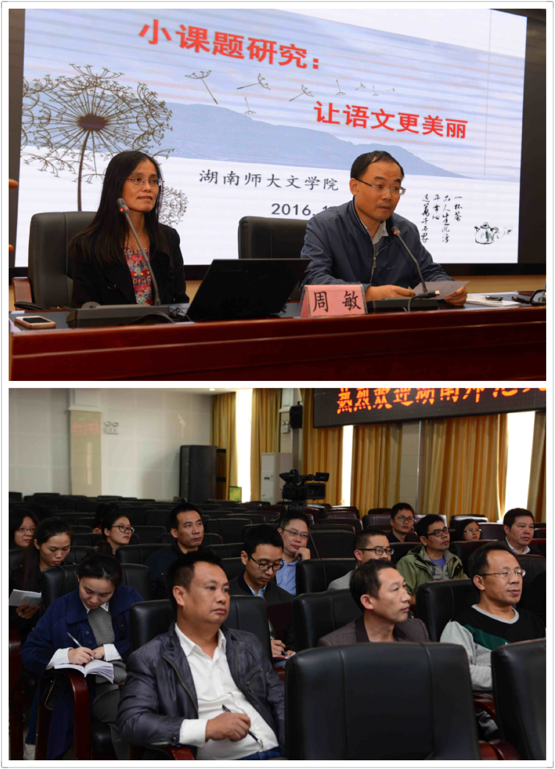 本次教研活动由长郡梅溪湖语文教研组组长杨新国老师主持,教育部国家级教学成果奖评审专家、湖南师范大学文学院硕士生导师周敏教授主讲。周敏教授围绕《小课题研究:让语文更美丽》,从小课题的价值定位、课题来源、优化策略三个方面为中学语文教学教研在广度和深度上的探索提供了指导性意见。