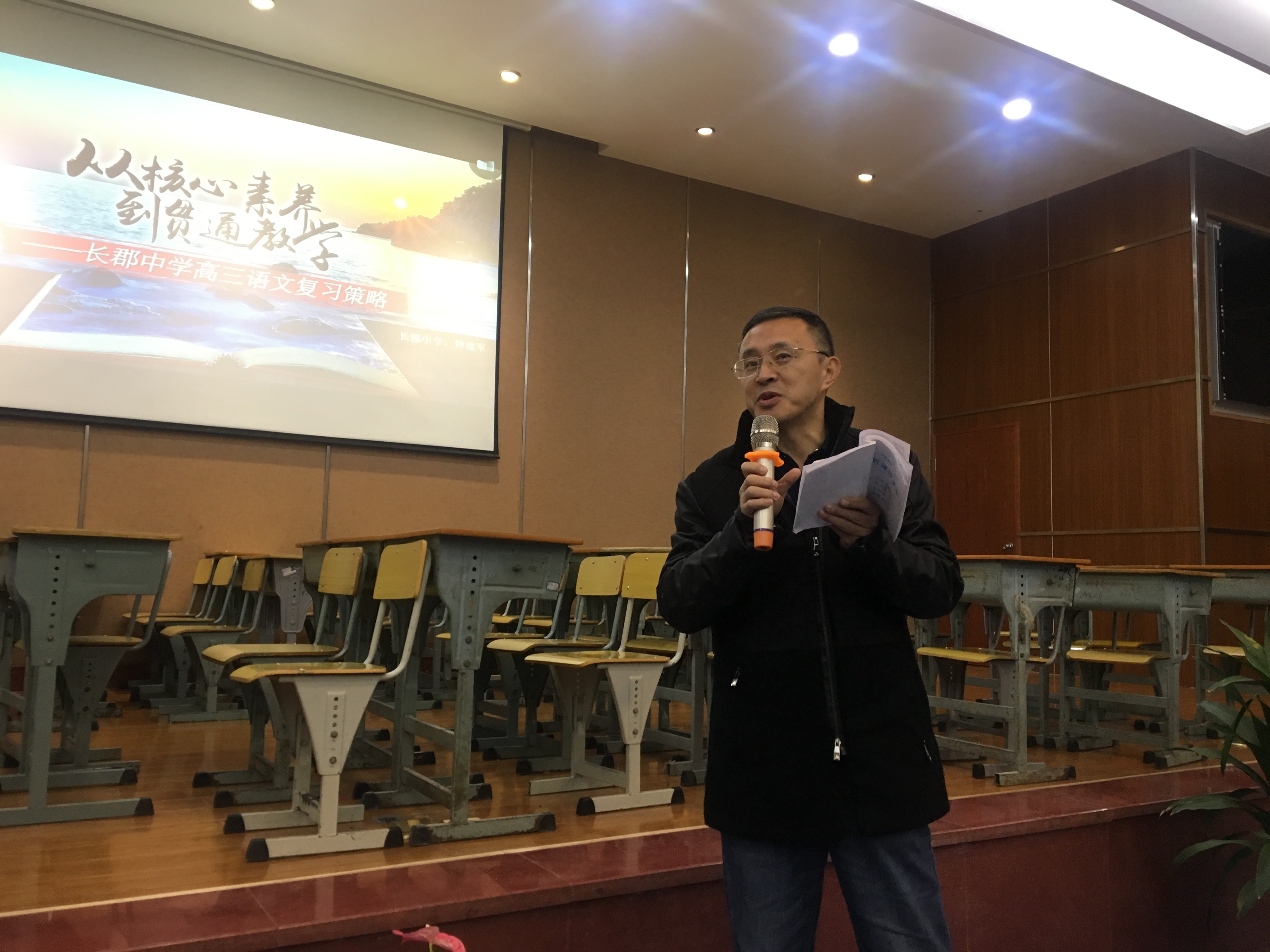2018年11月15日下午,长沙市教科院组织的高三语文研讨会在周南中学举行,高三全体老师参加了学习活动?;嵘?,长郡教研组长秦洁老师进行了评课,高三备课组长钟建军老师进行了题为《从核心素养到贯通教学——长郡中学高三复习策略》的重要讲座。