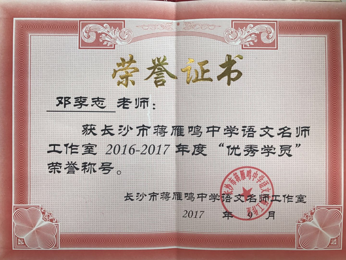 我校邓李志老师荣获蒋雁鸣中学语文名师工作室2016-2017年度优秀学员 作者:杨葵 来源: 发布时间:2017-10-09 浏览次数: 次 【字体:小 大】 2017年9月28日下午,长沙市蒋雁鸣中学语文名师工作室为了增强优秀学员的示范引领作用,提高学员们的热情和积极性,于明德中学召开了2016-2017年度优秀学员表彰会暨整本书阅读教学研讨会。 我校邓李志老师荣获蒋雁鸣中学语文名师工作室2016-2017年度“优秀学员”。 分享到: 【打印正文】