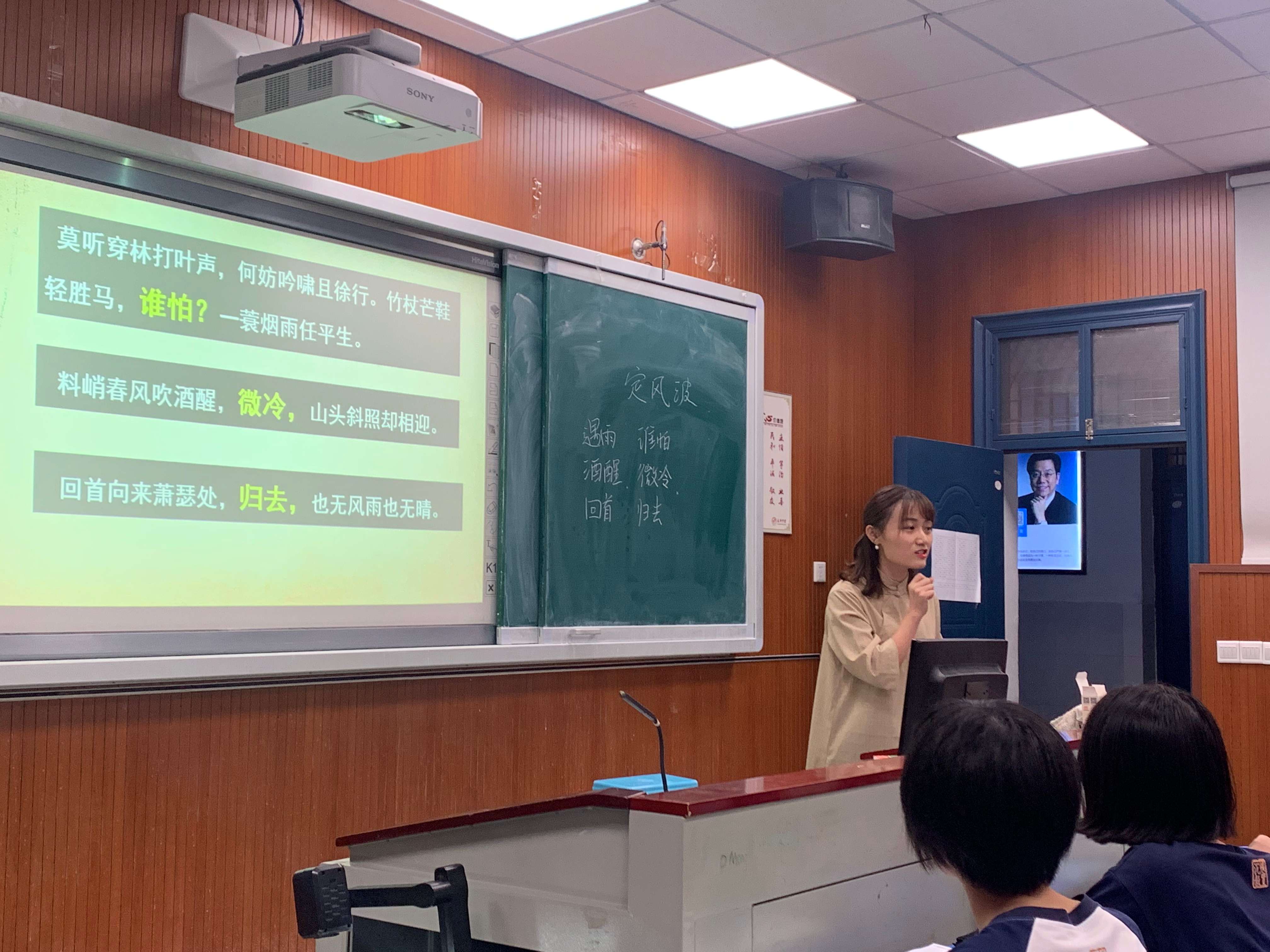 蒋诗琦老师的《一颦一笑总关情》通过自己的“课堂三笑”为大家阐释了由神态描写体现的人物个性,彰显了笔下“千人千态”的奥秘?;圃撇ɡ鲜Φ摹督裉炷阕ⅰ敖趵稹绷寺穑俊纷⒛苛餍写视铩敖趵稹?,引我们关注对流行文化的拥抱、辨析与选择。周鑫琳老师的《定风波》从黄绮珊对苏轼的词作改编出发,以“谁怕”、“微冷”、“归去”为钥匙,带大家领悟了苏轼的泰然、欣然与超然。曾丹老师的《“貌”不惊人誓不休》,从宝黛初会引出肖像描写手法,并让孩子们学以致用,写出心中的周禄丰老师。朱箫箫老师的《从“夜缒而出”说起》直击一个“缒”字,通过周密的分析带学生感受了《左传》“言简义丰”的特点。焦子薇《物色之动,心亦摇焉》从“紫色”说起,引导学生分析了大堰河的形象,和艾青具有绘画性的创作特点。