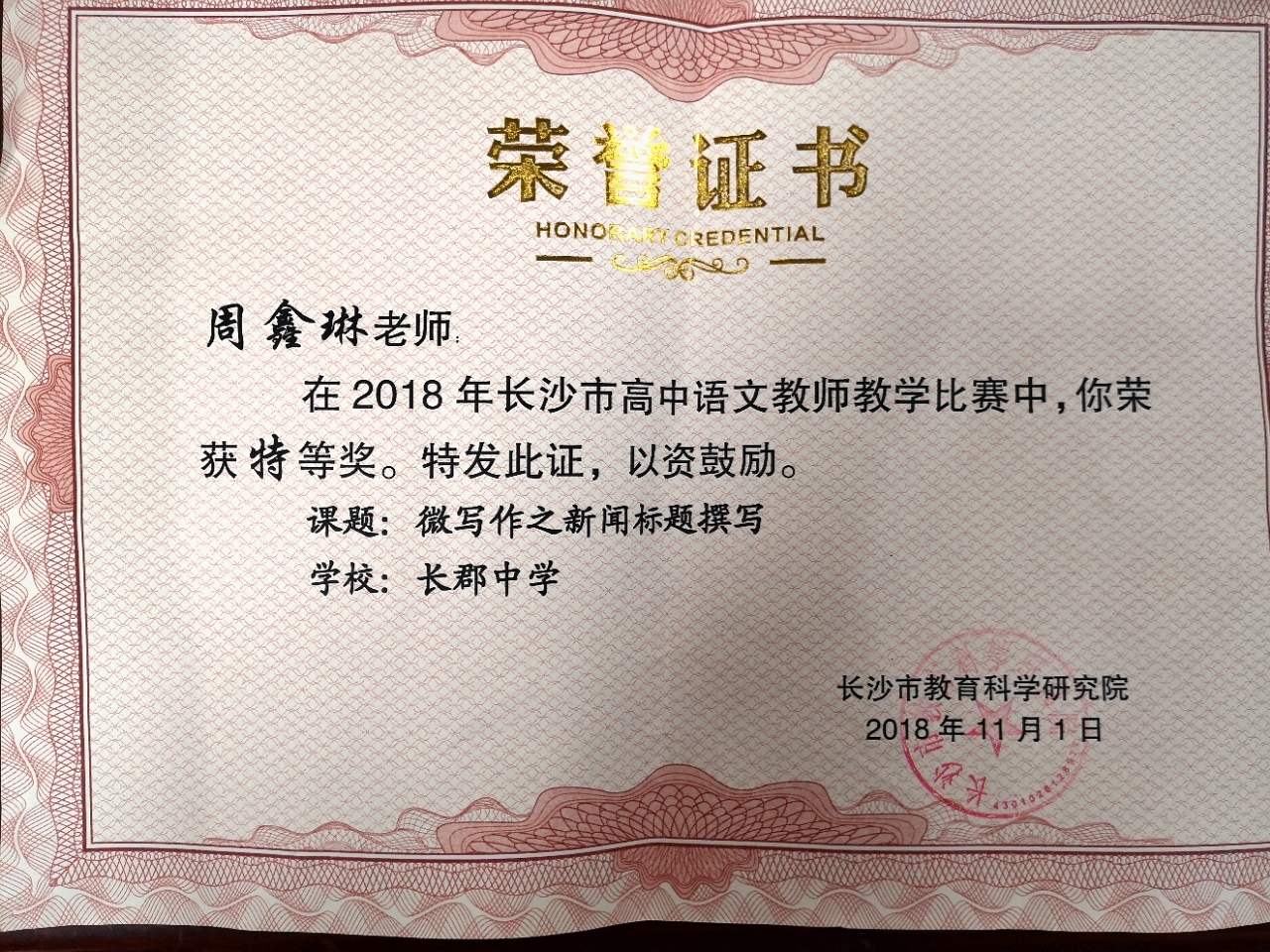 【语文】喜讯!我校周鑫琳老师在市高中语文教师教学比赛获特等奖! 作者: 来源: 发布时间:2018-11-16 浏览次数: 次 【字体:小 大】 我校周鑫琳老师微课《微写作之新闻标题撰写》在2018年长沙市高中语文教师教学比赛中荣获特等奖。 分享到: 【打印正文】