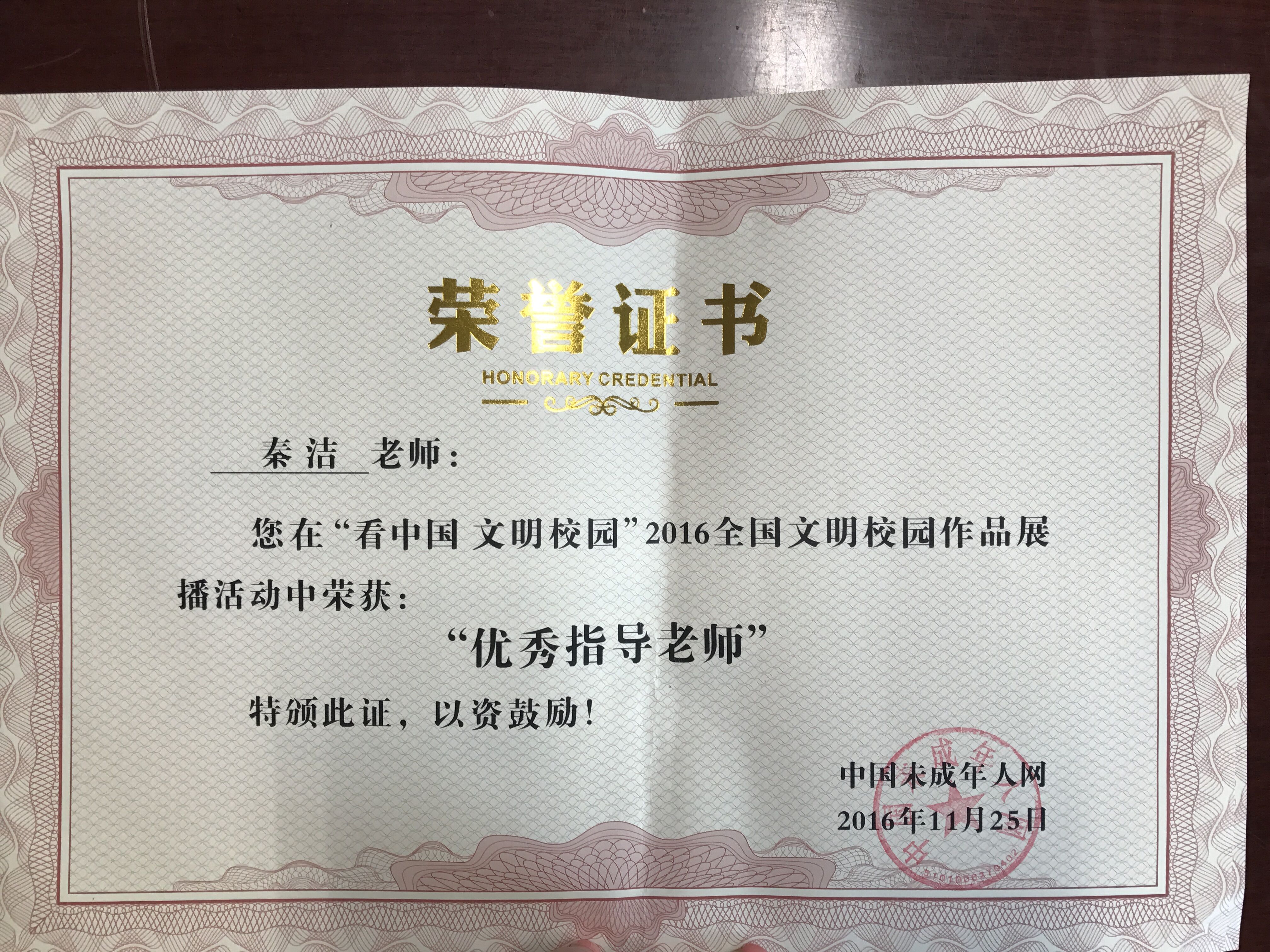 秦洁老师获“看中国 文明校园”2016年全国文明校园作品展播活动优秀指导老师 作者:杨葵 来源: 发布时间:2017-03-27 浏览次数: 次 【字体:小 大】 秦洁老师获“看中国 文明校园”2016年全国文明校园作品展播活动优秀指导老师 分享到: 【打印正文】