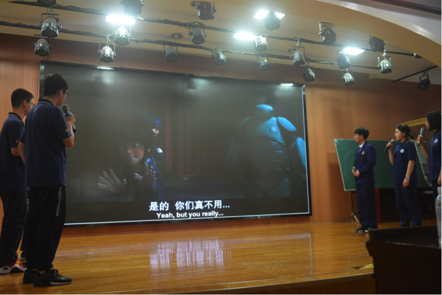 随后,来自1812班的刘昱芊、谭涵哲、代爃榤、袁真真、杨昕羽、钟尧为《超能陆战队》中的精彩片段进行配音,电影中追逐的激动紧迫感在选手们声情并茂的展示中体现得淋漓尽致,现场氛围一度被推向高潮。