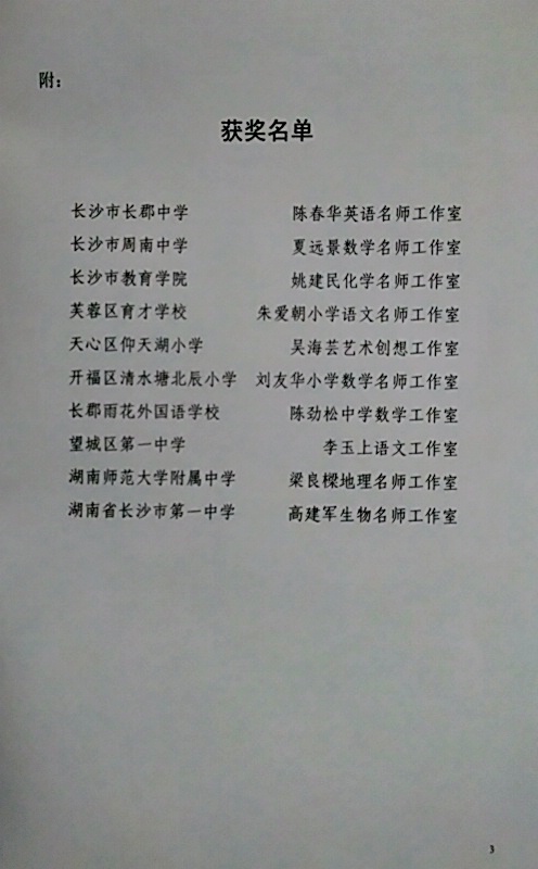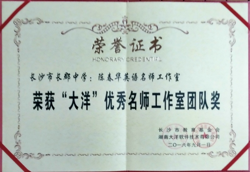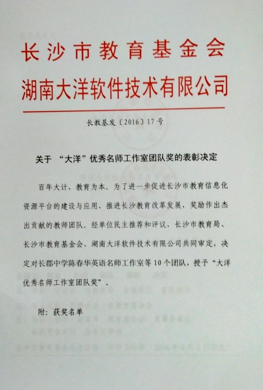 2016年9月7日,长沙市庆祝第32个教师节暨优秀教师表彰大会在麓山国际实验小学举行,会上表彰了长沙市首届“大洋奖”优秀名师工作室团队。长沙市长郡中学陈春华英语名师工作室荣获该团队奖项。