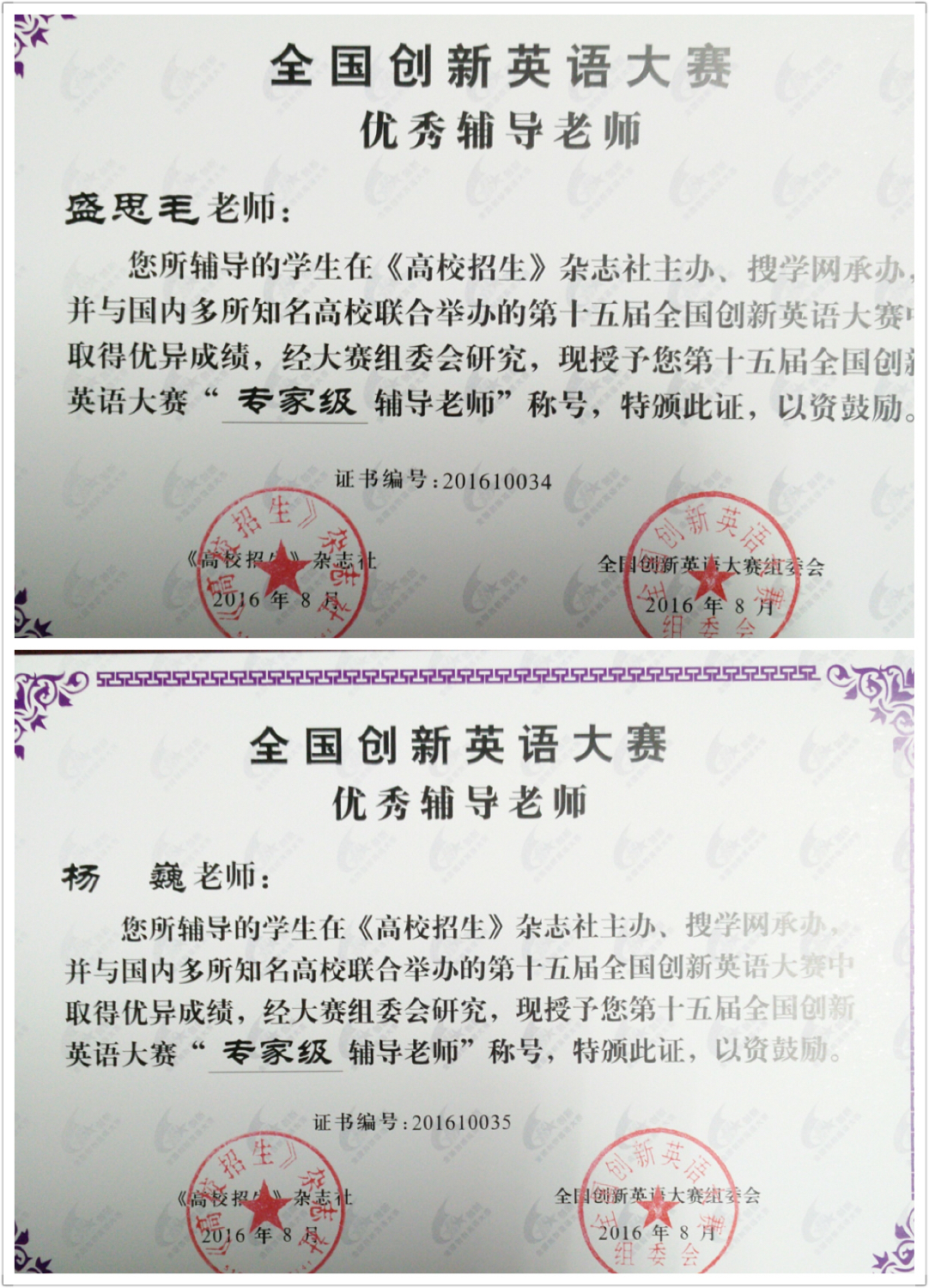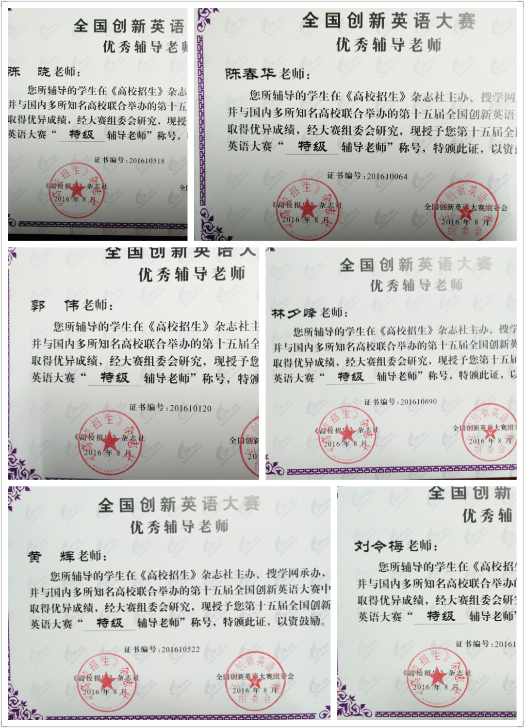 第十五届全国创新英语大赛于2016年7月29日在京圆满落幕。我校选手在比赛中表现突出,凭借出色的英语水平,获得了大赛评审的高度肯定,取得了优异的成绩。