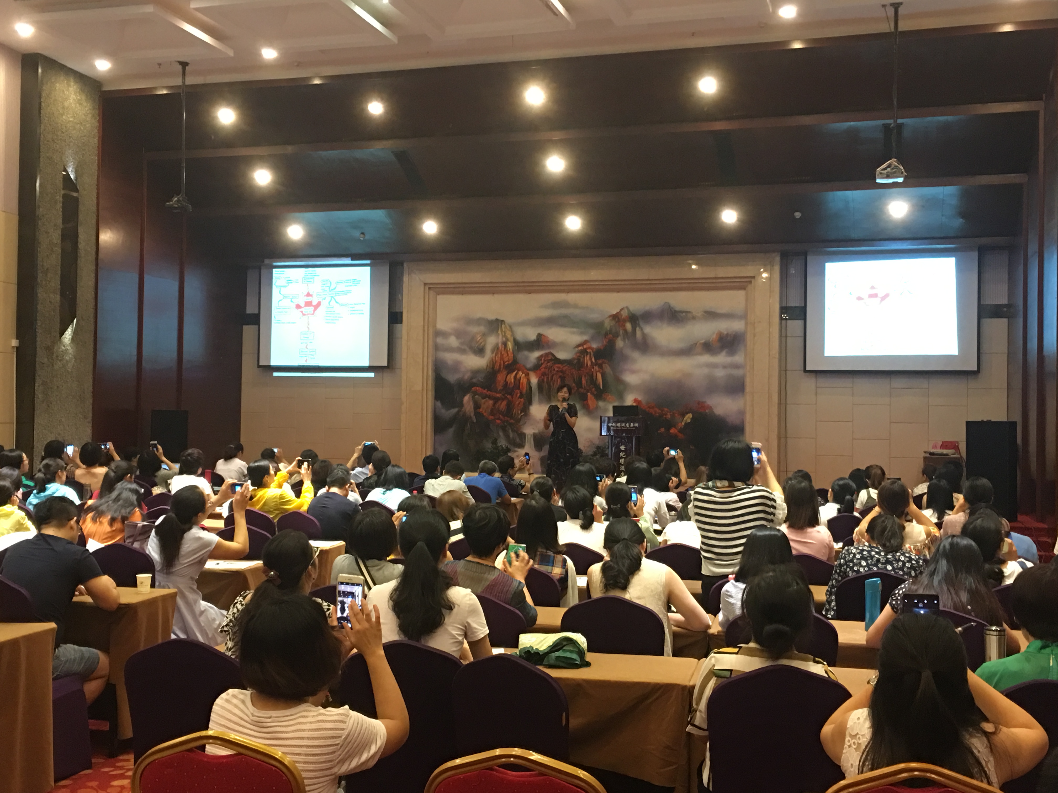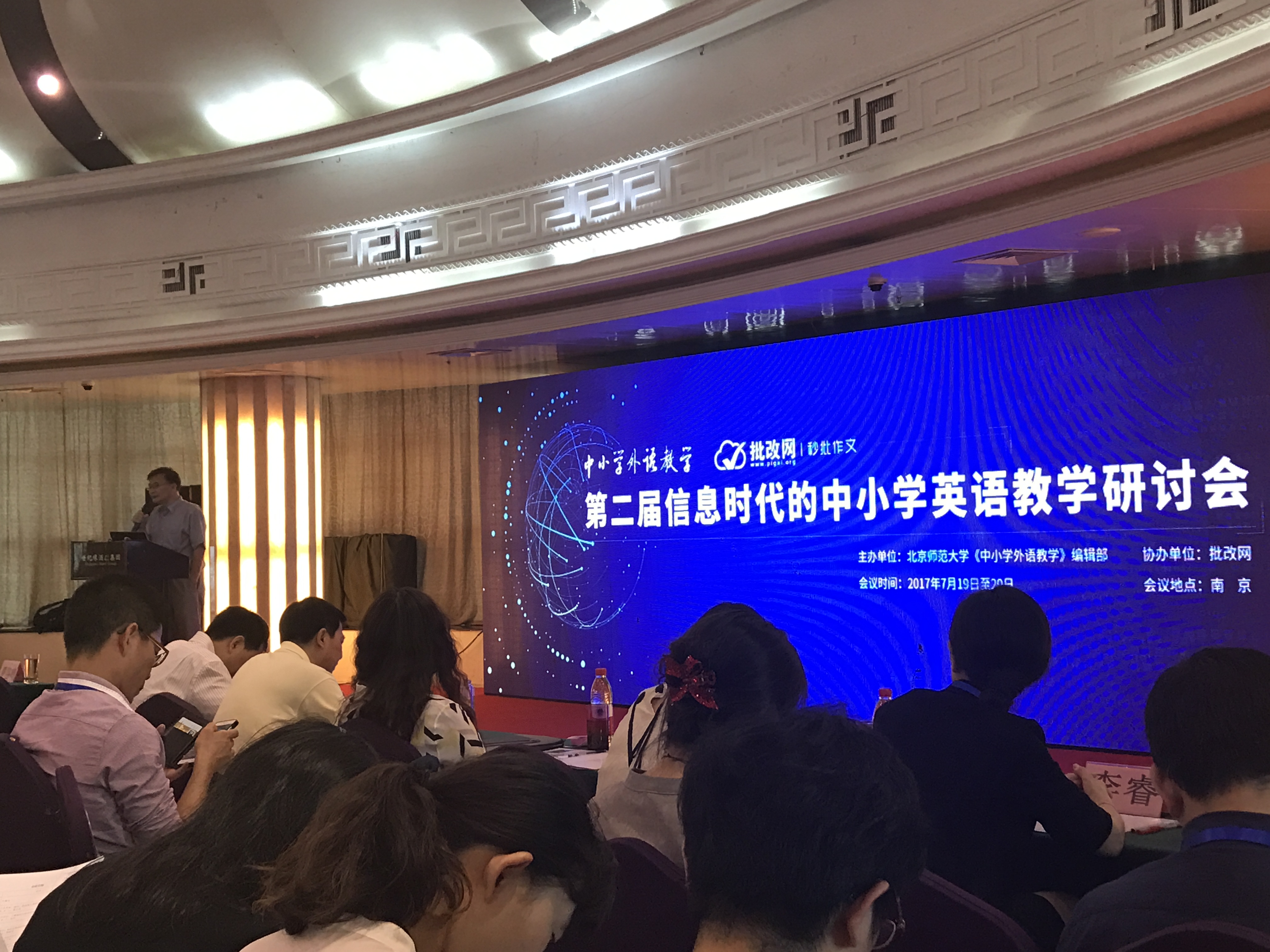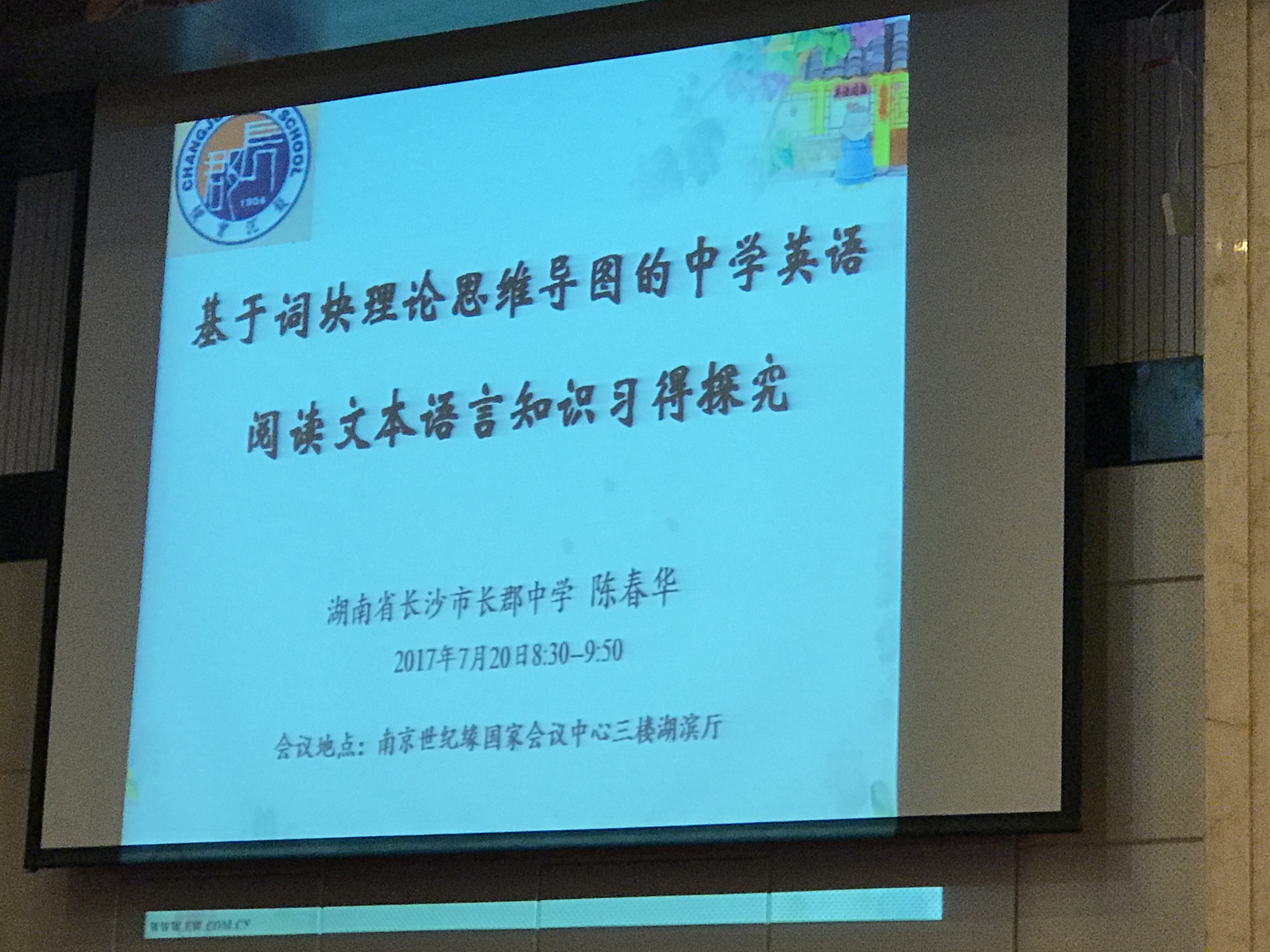 7月19-20日,第二届信息时代的中小学英语教学研讨会在南京世纪缘国际会议中心举行,来自全国各地500余名专家、学者及中学一线的教研员和教师汇聚一堂,围绕新时期核心素养的培育和落实以及信息时代下的英语教学等问题进行全面深入的交流研讨。我校英语教研组长、特级教师陈春华老师受邀在会上作专题发言《思维导图词块文本与英语表达能力的提升——基于词块理论思维导图的中学英语阅读文本语言知识教学探究》,本场讲座在最大的分会议中心举行,现场座无虚席?;嵘希吕鲜Ψ窒砹怂鞒值氖〖吨氐憧翁庑牡煤统晒?,对运用词块理论、思维导图理论和基于信息技术的英语写作教学实例进行了详细的阐述,赢得了会场的阵阵掌声?;岷?,许多老师都纷纷上台进一步请教,并主动邀请与陈老师合影留念。 陈春华老师作为本次大会发言的唯一湖南代表在专题讲座中很好地呈现了长郡中学英语教研组及其本人和名师工作室在近年来所做出的研究成果,并展示了部分学子在所运用的教学方法中产生的优秀作品,令与会的全国专家和老师称赞不已,充分体现了我校英语教研组近年来对于核心素养和信息化的背景下英语教学的改革、探索和实践。