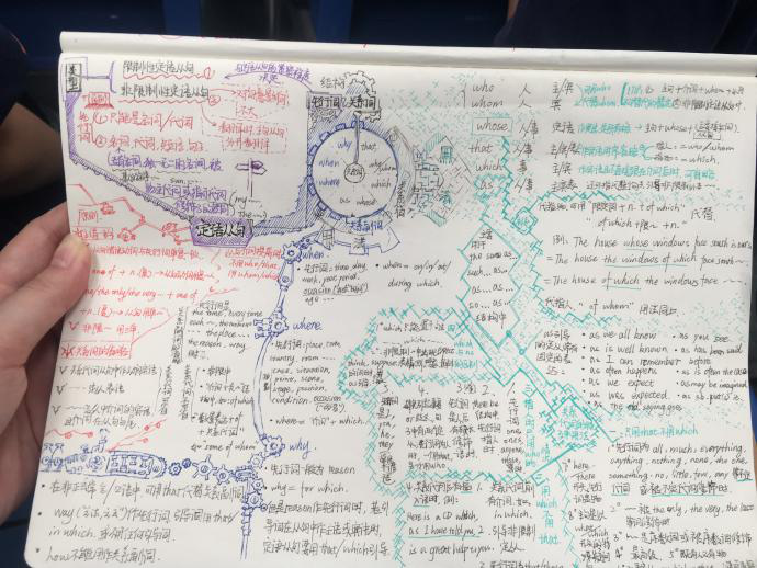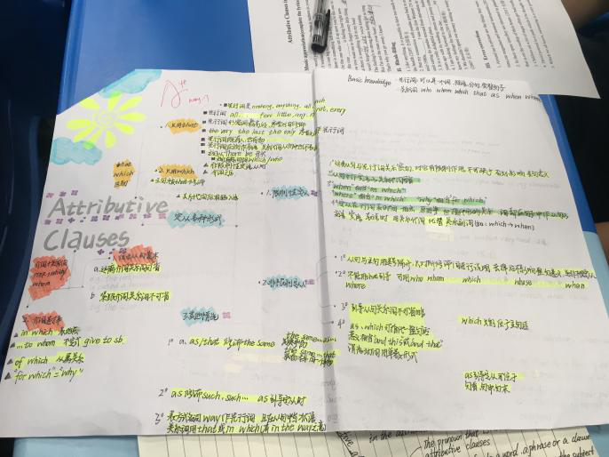 接着,就是将前一天布置的作业定语从句的思维导图让组内学生互相分享,然后推荐组内优秀的思维导图作品上讲台分享。课上分享了两组同学的优秀作品?;谘淖髌罚ɡ鲜υ俳泄槟捎氩钩涠ㄓ锎泳涞乃嘉既氡乇敢?,如Definition, Structure, Relative words,Types。然后就是定语从句的巩固训练。龚老师特别用心地找出近三年有关定语从句的语法填空和改错题让学生进行操练。下一个步骤是将定语从句升华到怎样助力写作多样性的主题上。用与学生息息相关的图片让学生进行picture talking,顺序是按照控制--半控制--自由发挥。最后落到group work,让学生围绕An unforgettable__________进行讨论,展示主题和形式均可以多样化。