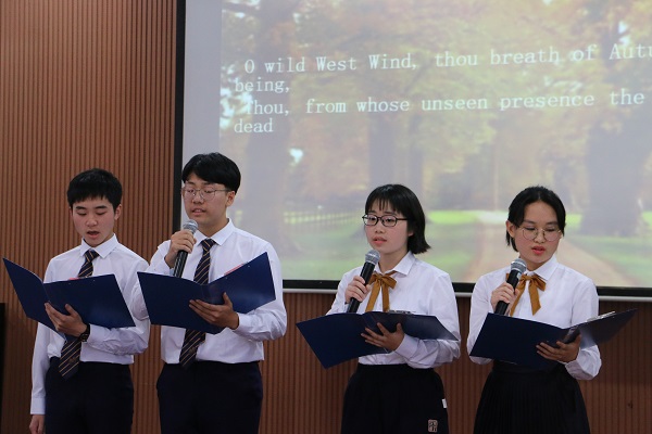 由1712班和1719班共同朗诵雪莱的名篇Ode to the west wind开启整场朗诵会,那声坚定、铿锵的问询If Winter comes , can Spring be far behind?是发自心底面对世界的勇气和对光明的向往。