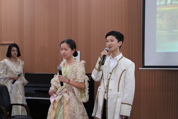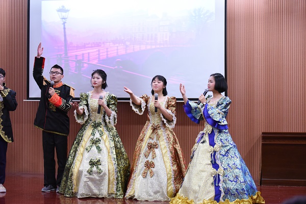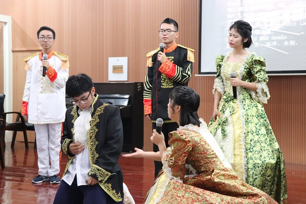 王尔德这位浪漫的作家笔下的金银柳之恋格外婉约温柔,1711班充满中世纪欧洲宫廷风格的服装华丽而夺目,伴随着娓娓动听的朗诵,仿佛带人感受到了诗中那沉醉爱情的甜蜜与挣扎。