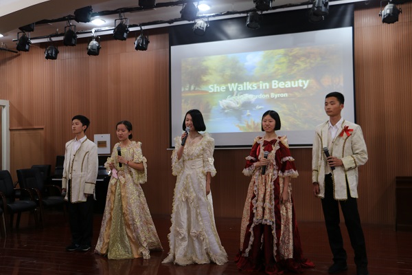 She walks in beauty,一首赞美女性的诗歌,既有女生柔美嗓音的刻画,又有男生抑扬顿挫的铿锵打磨。这首诗在1702班的朗诵声中幻化一副优美画面:有位佳人,跃然眼前,巧笑倩兮,美目盼兮。