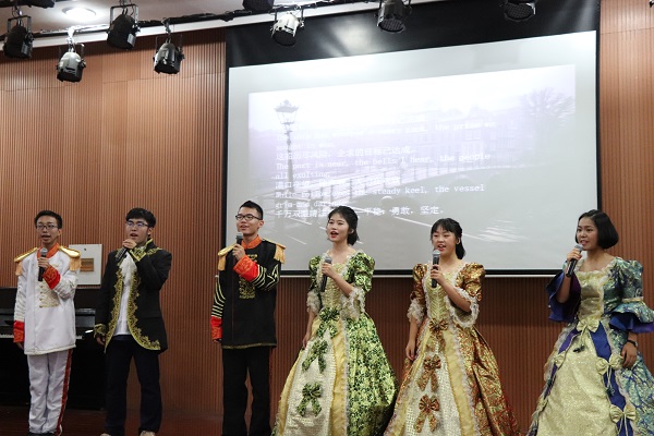 1705班和1716班一起带来的Oh captain,my captain既有高亢利落的朗诵又伴有婉转的歌声,听起来高低起伏,恰到好处。仿佛身临其境,与船长征战海上。